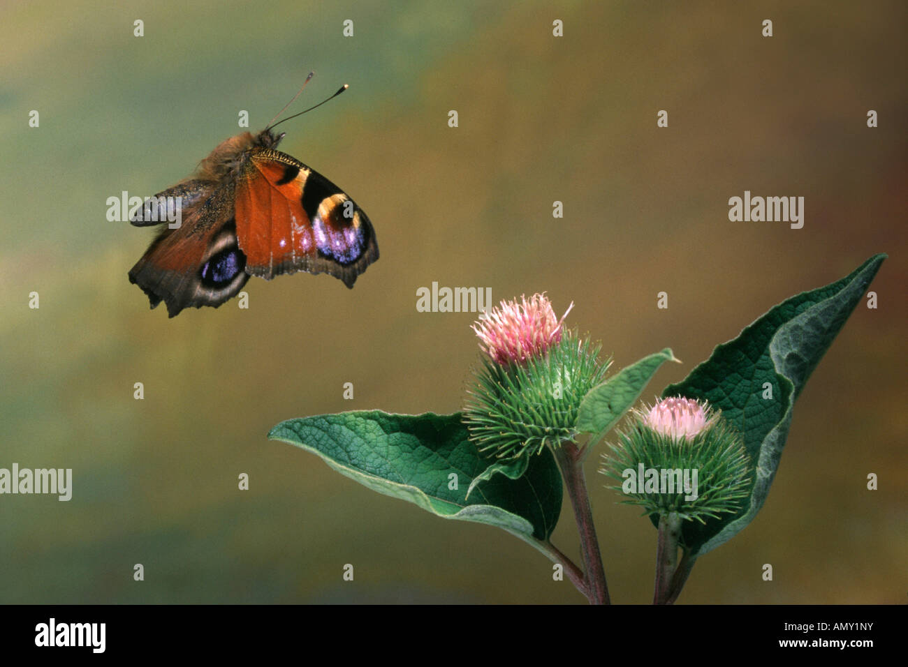 Close Up Of Peacock Butterfly Flying Over Flower Stock Photo