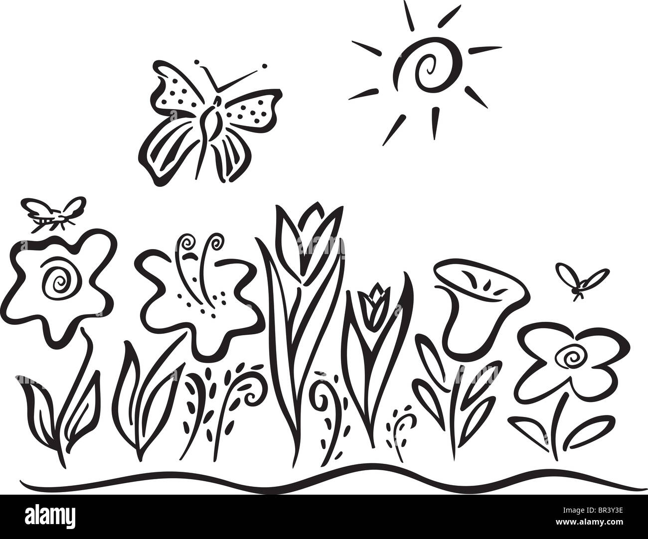 A Butterfly Flying Over Flowers Stock Illustration Kids