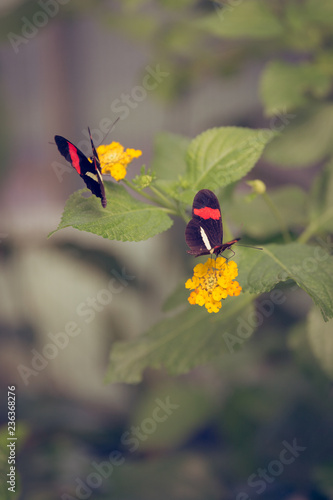 Two Butterflies On Beautiful Flowers In A Butterfly Garden