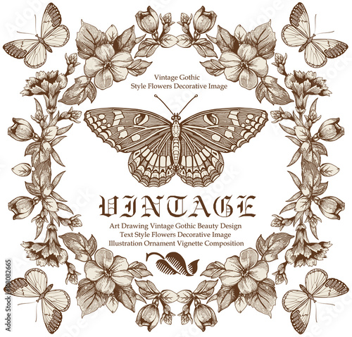Butterfly And Flowers Drawing Vintage Engraving Style Stock